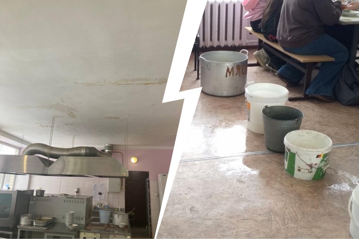 Фотографии из школьной столовой демонстрируют последствия протечек и импровизированные меры.