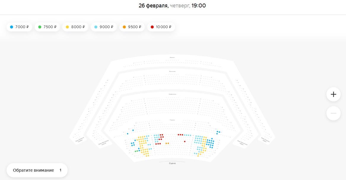 Согласно данным «Яндекс Афиши», подавляющая часть зала уже занята, включая наиболее дорогие места в первых рядах. Для покупки доступны лишь 144 места в партере, их стоимость колеблется от 7 до 10 тысяч рублей.