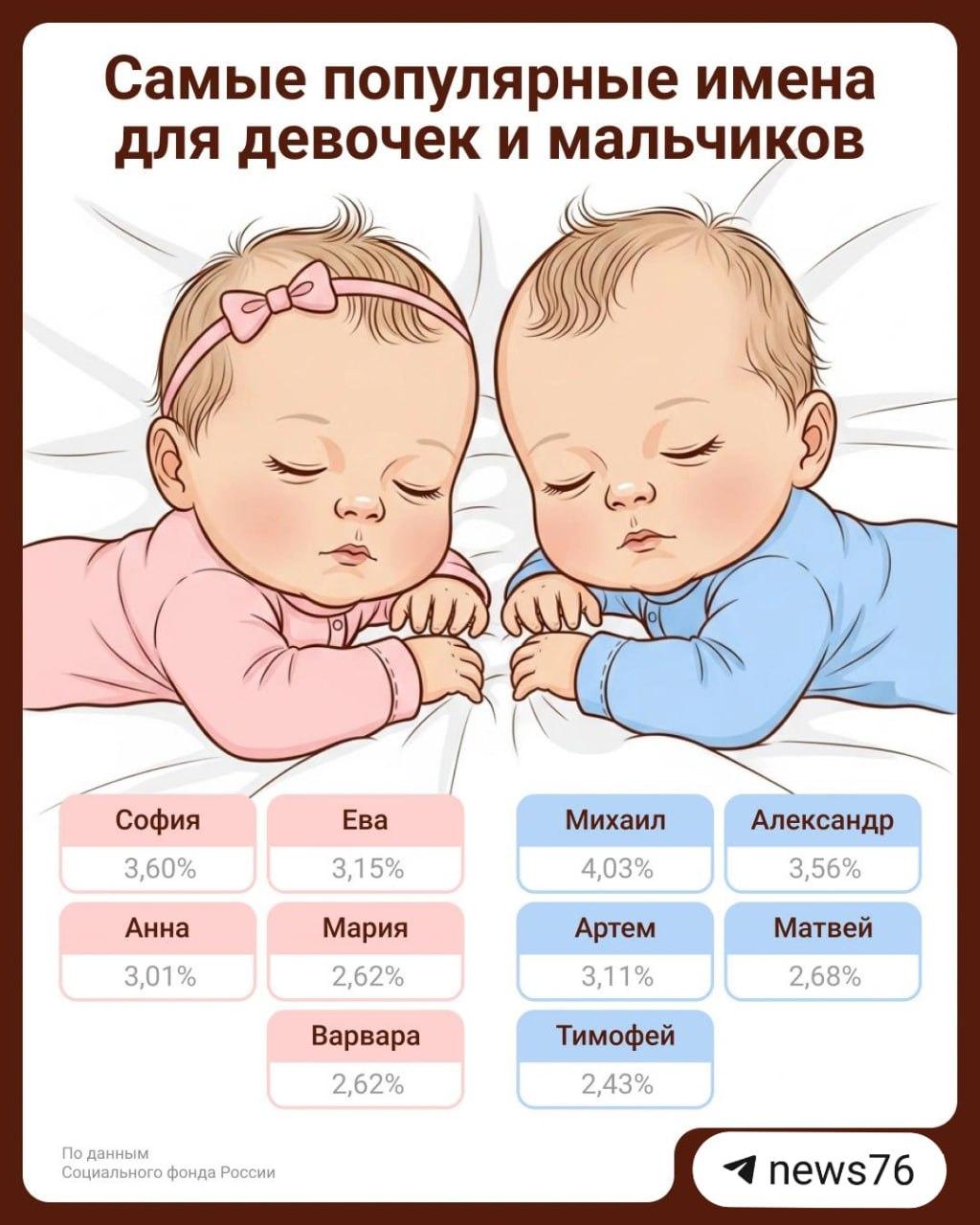 Рейтинг самых частых имён для детей в Ярославской области в 2025 году.
