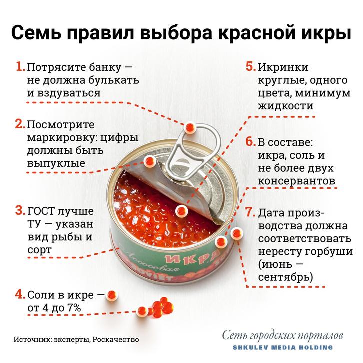 «Икра не должна быть кислой, ярко пахнуть, в ней не должно быть сильной горечи: если она присутствует, то это может говорить о вредных добавках или вообще икру могли взять из мертвой рыбы», — объяснил Андрей Калугин.