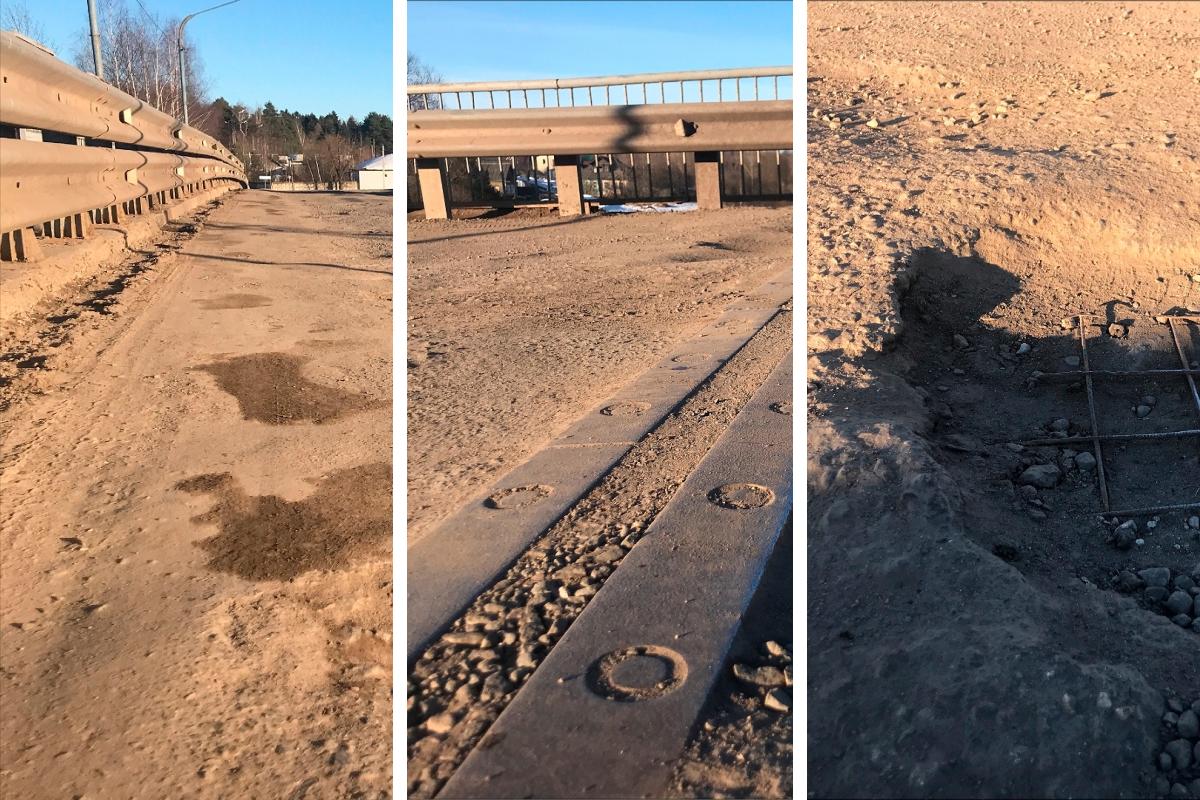 На дорожном полотне моста образовались выбоины, обнажившие арматуру.