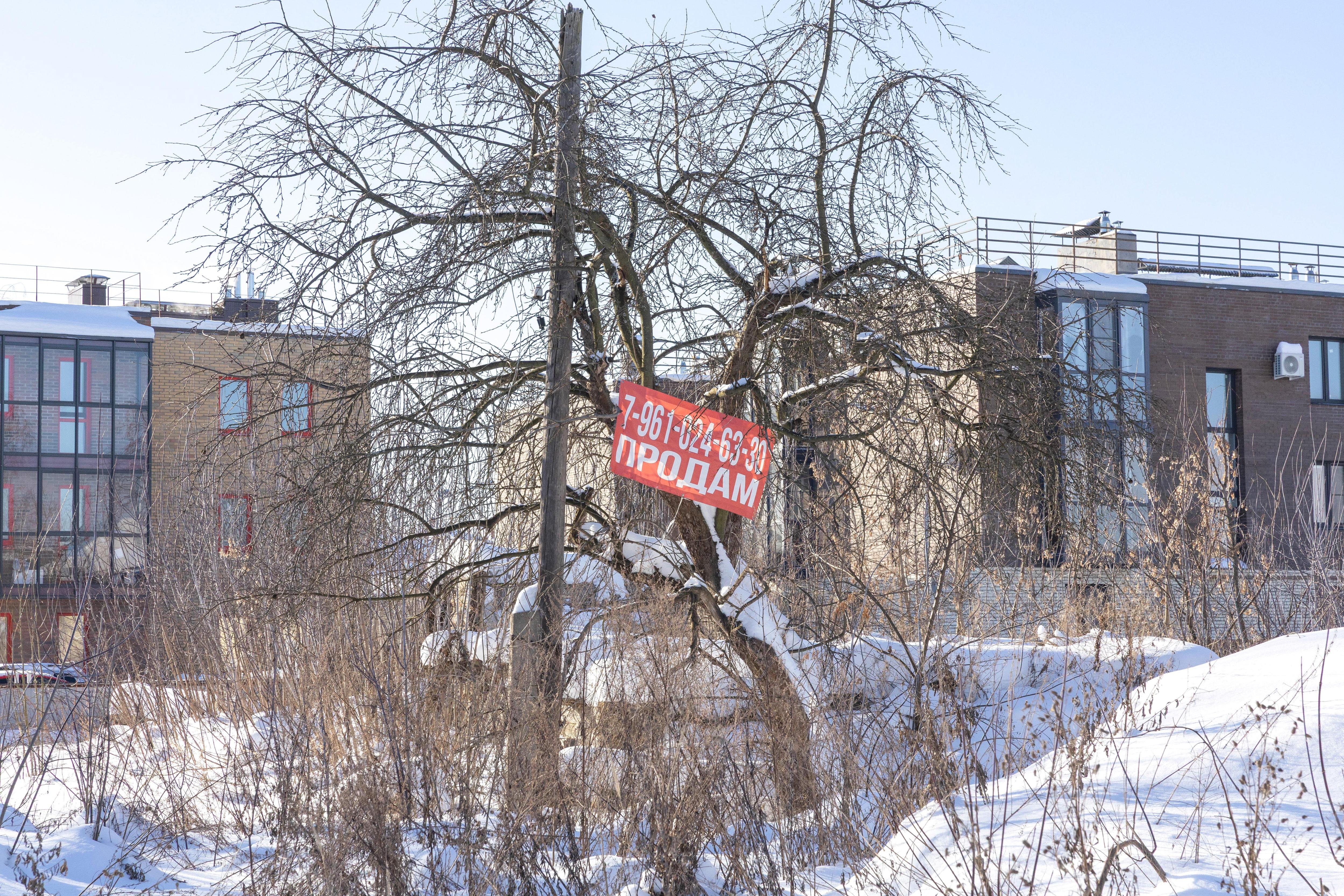 На улице был найден один заросший свободный участок. Контактный телефон из объявления не функционировал, но на сайте «Циан» имелась информация: земля площадью 8,91 сотки предлагалась за 8,6 млн рублей с 2024 года, а объявление сняли в январе 2026-го. Вероятно, участок уже продан. Других свободных земель в продаже на текущий момент нет.