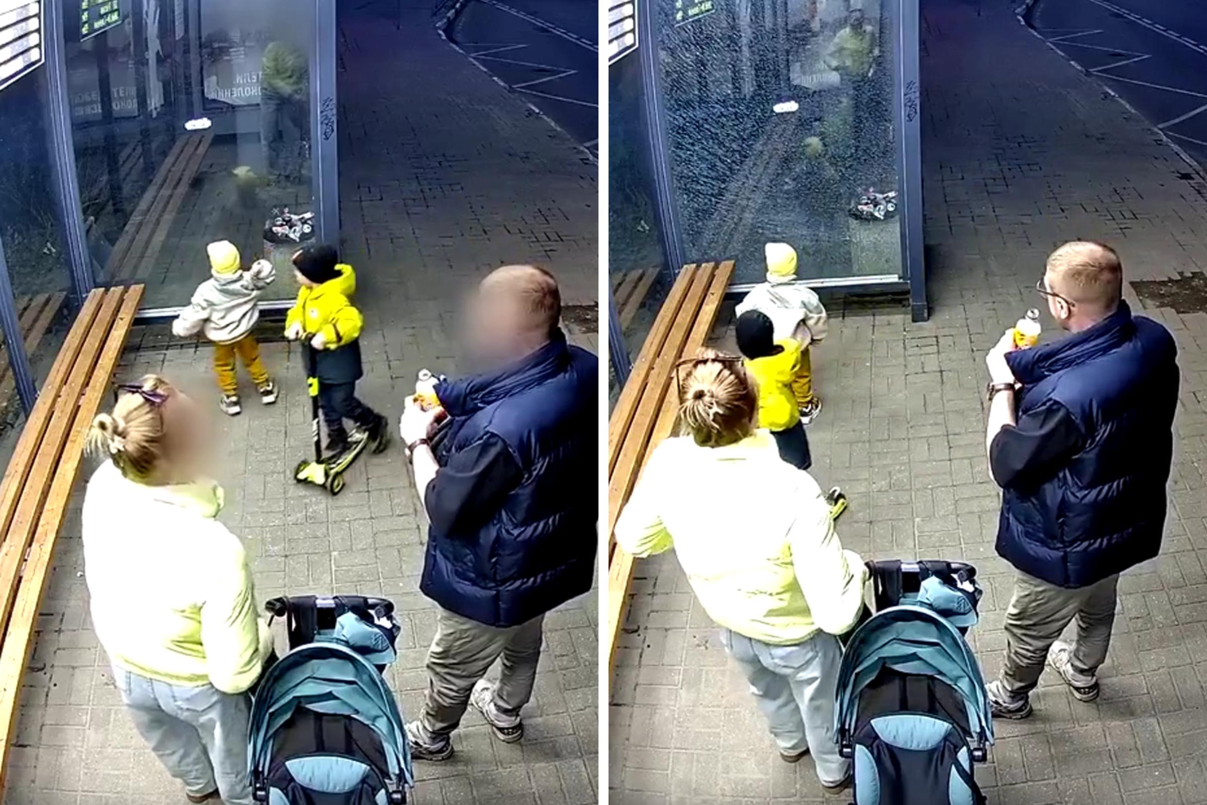 На кадрах видно, как малыш бросает в остановку предмет, похожий на камень. Стекло мгновенно разбивается. Женщина, предположительно мать, сначала осматривает ребенка, а затем оглядывается по сторонам.