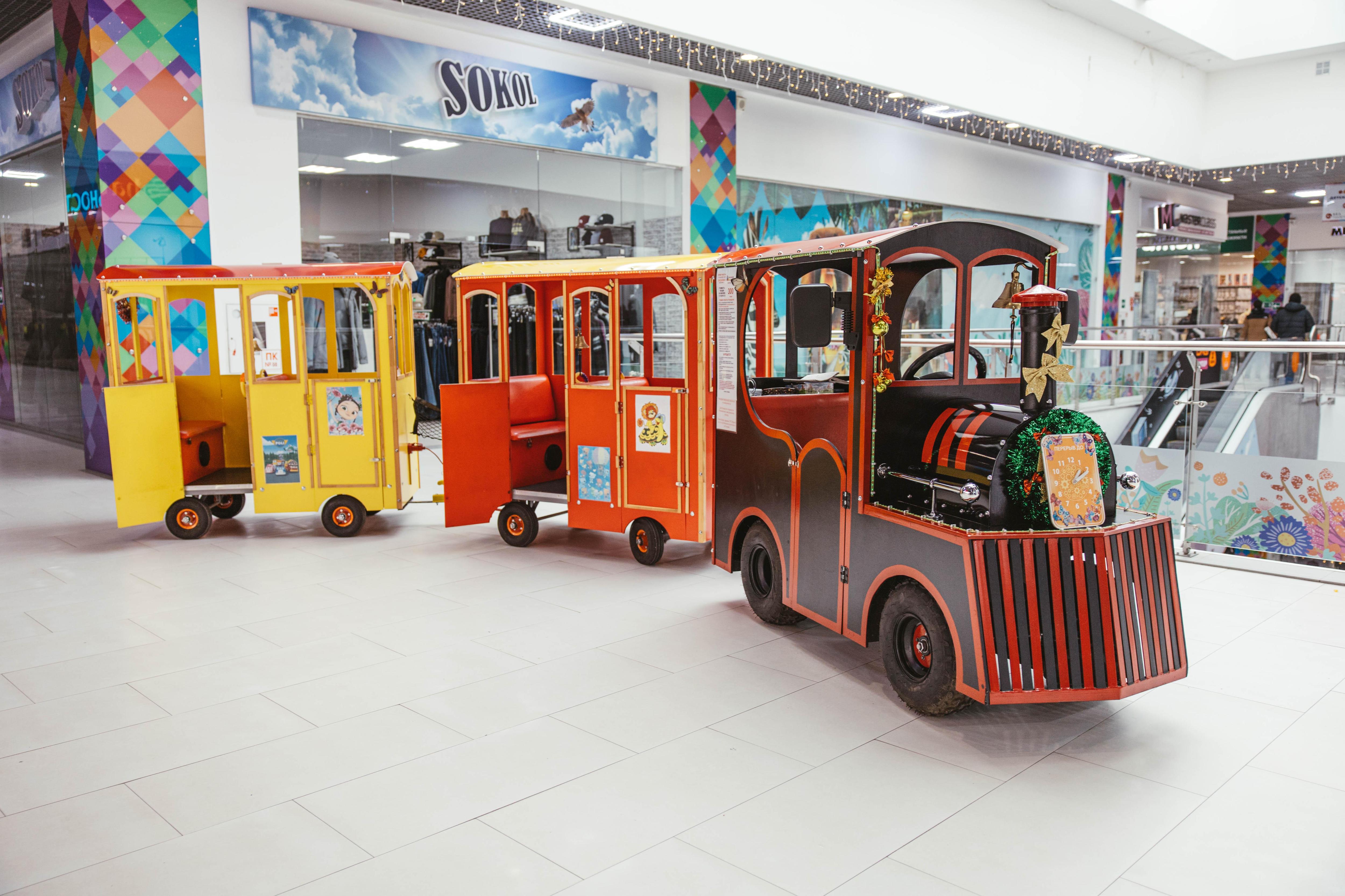 По второму этажу курсирует детский паровозик.
