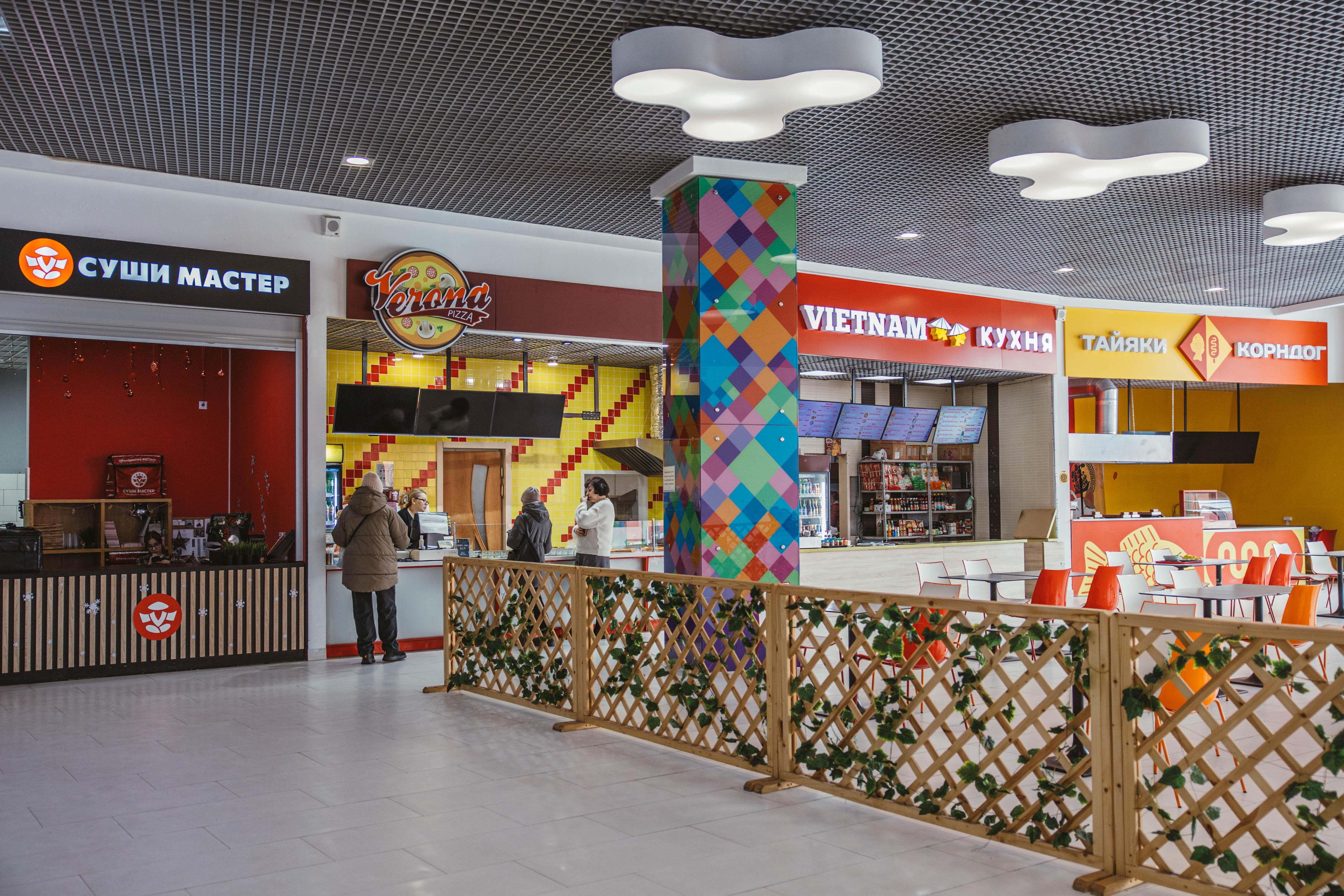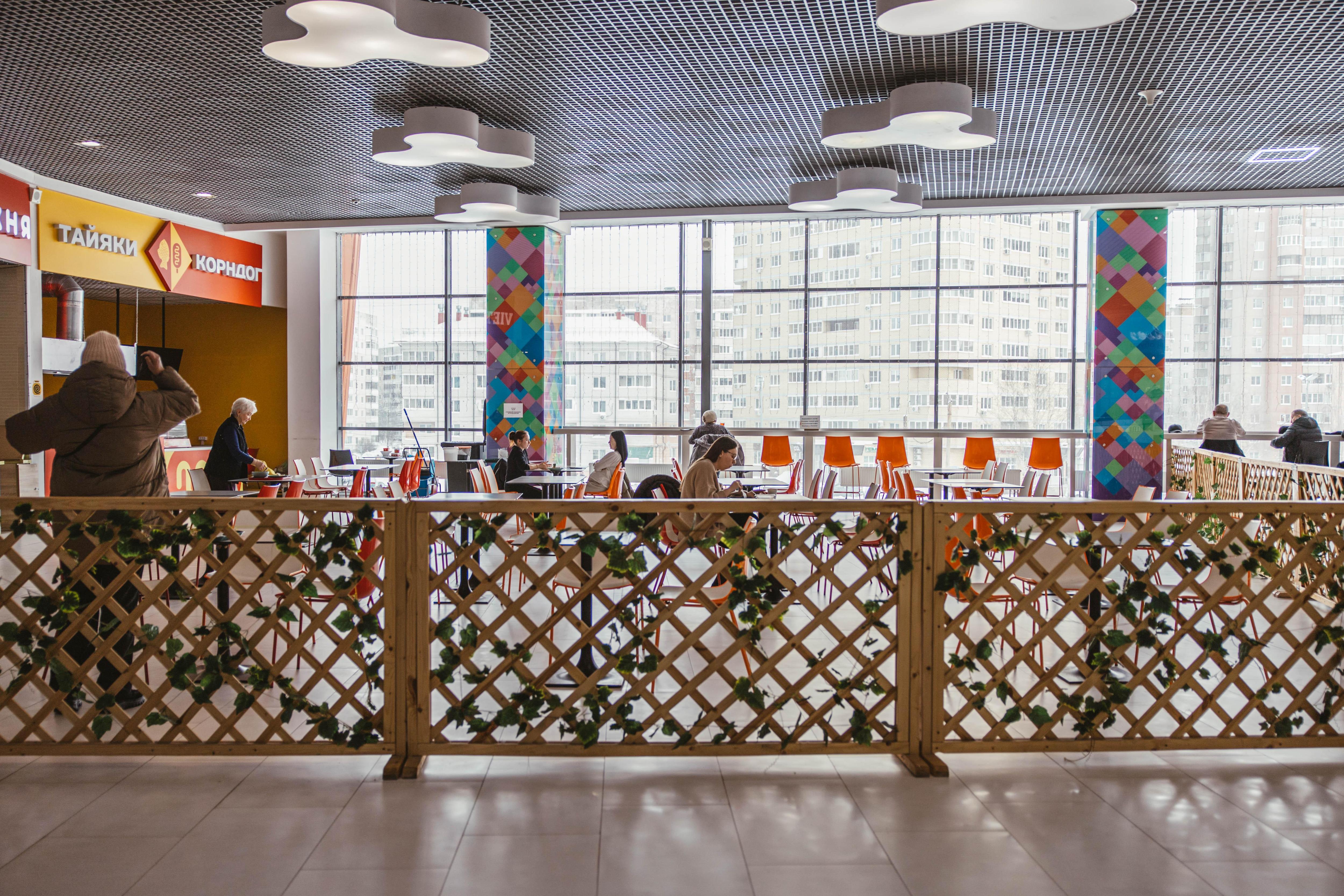 Столы на фуд-корте огорожены для комфортного перекуса.