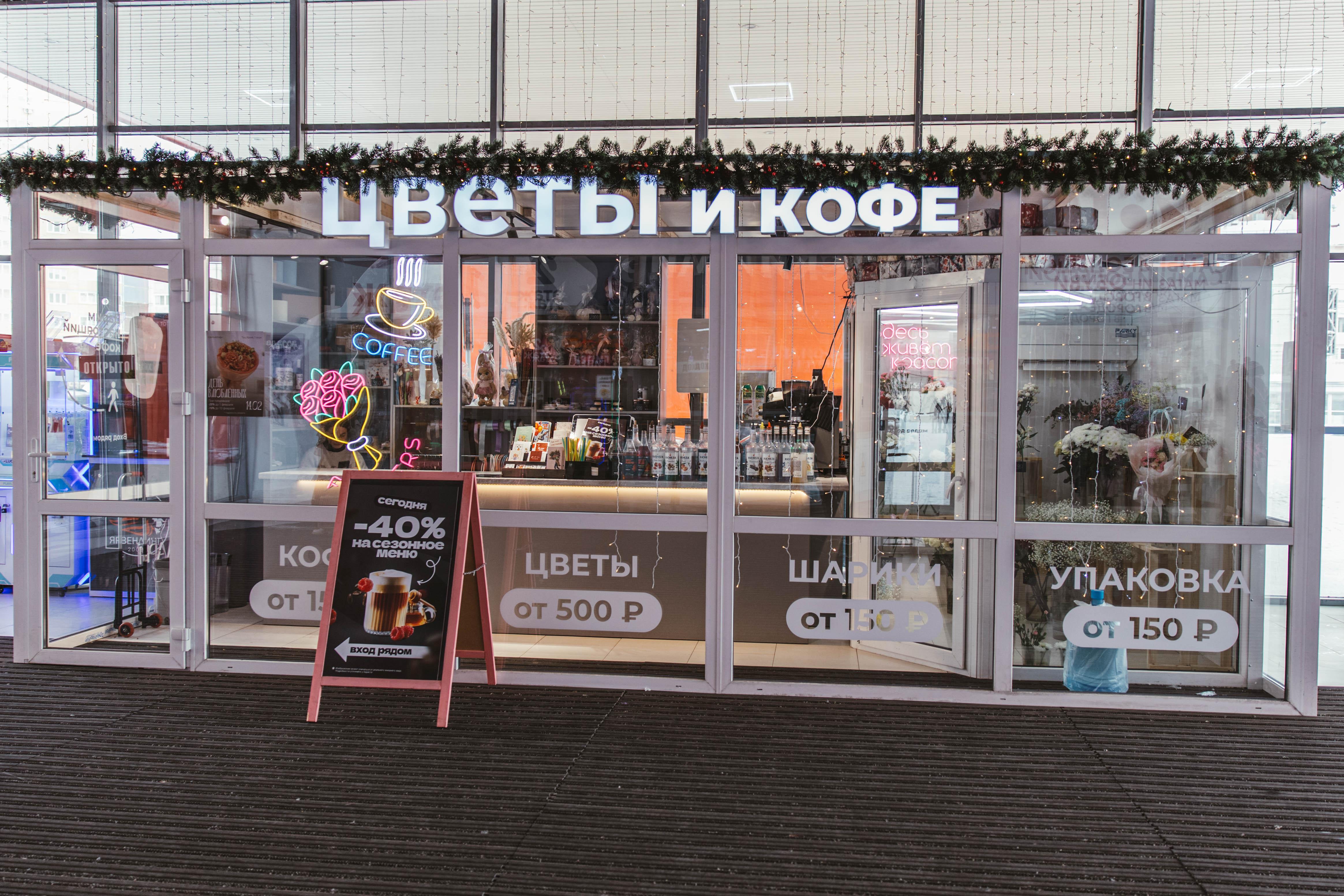 У входа расположен цветочный магазин, совмещенный с кофейней.