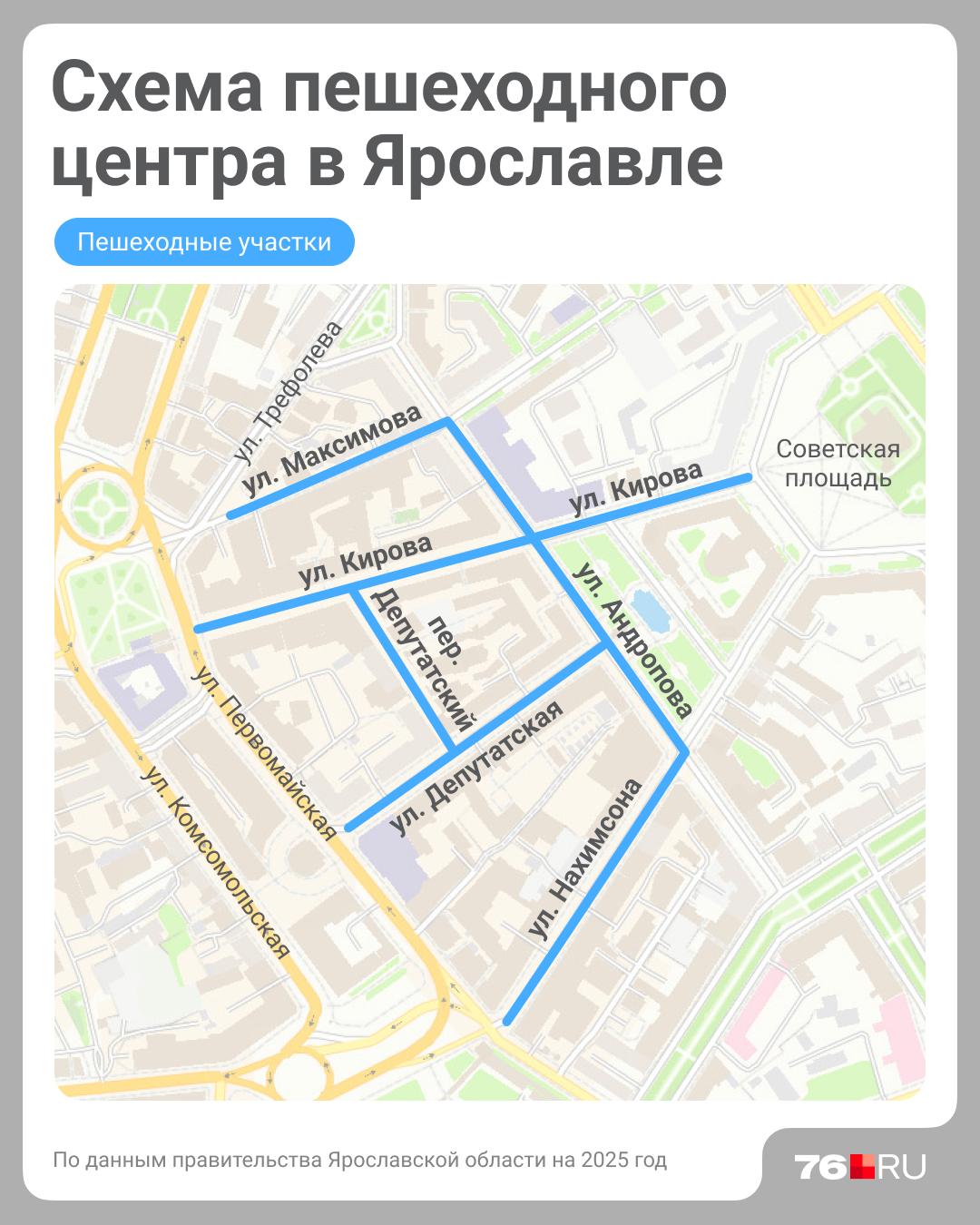 Карта улиц, которые планируется сделать пешеходными в Ярославле