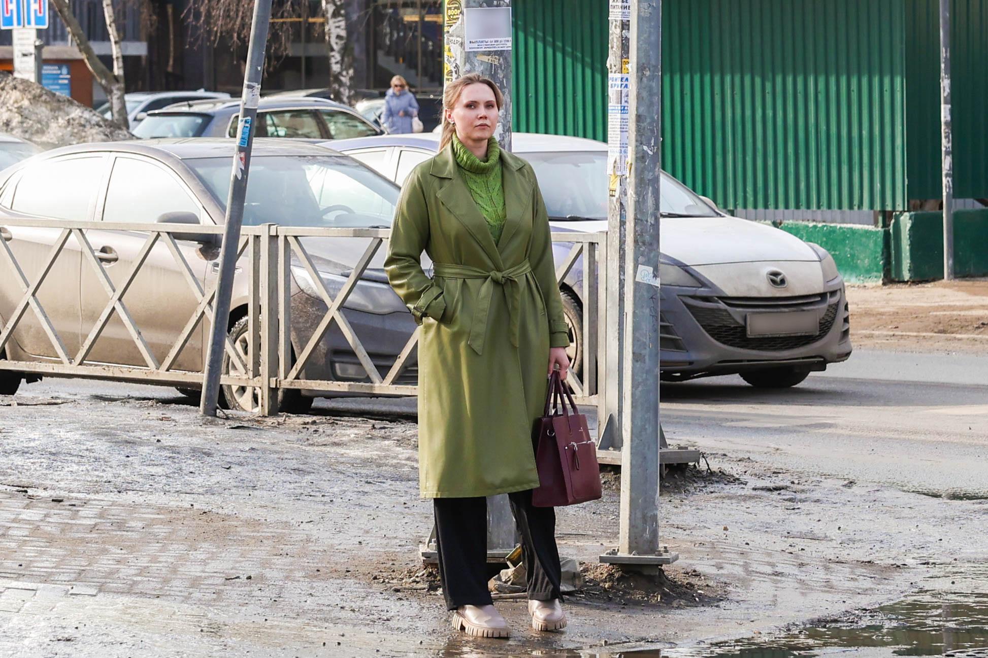 Зелёный цвет в одежде добавляет свежести, пока природа ещё не полностью пробудилась.