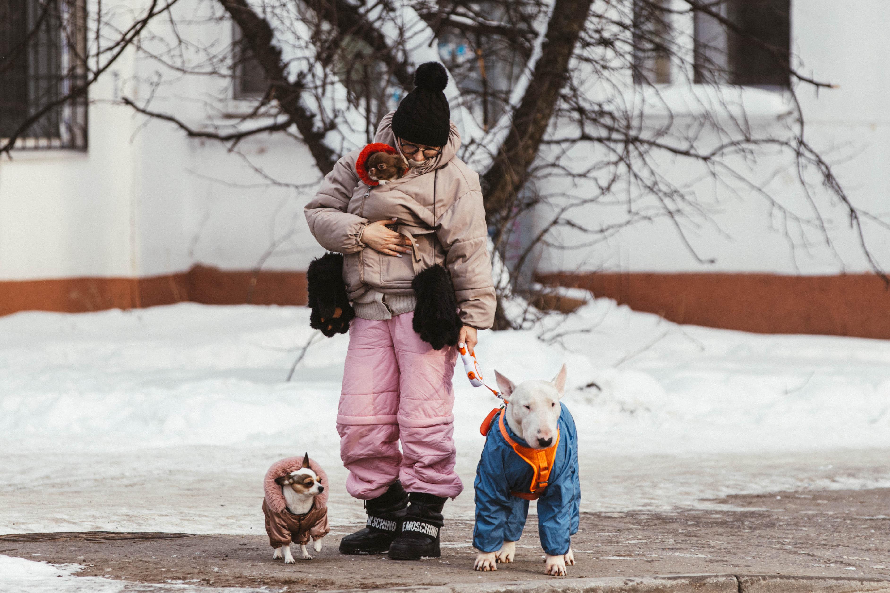 Утепляются все, включая собак, которых одевают в специальные куртки.