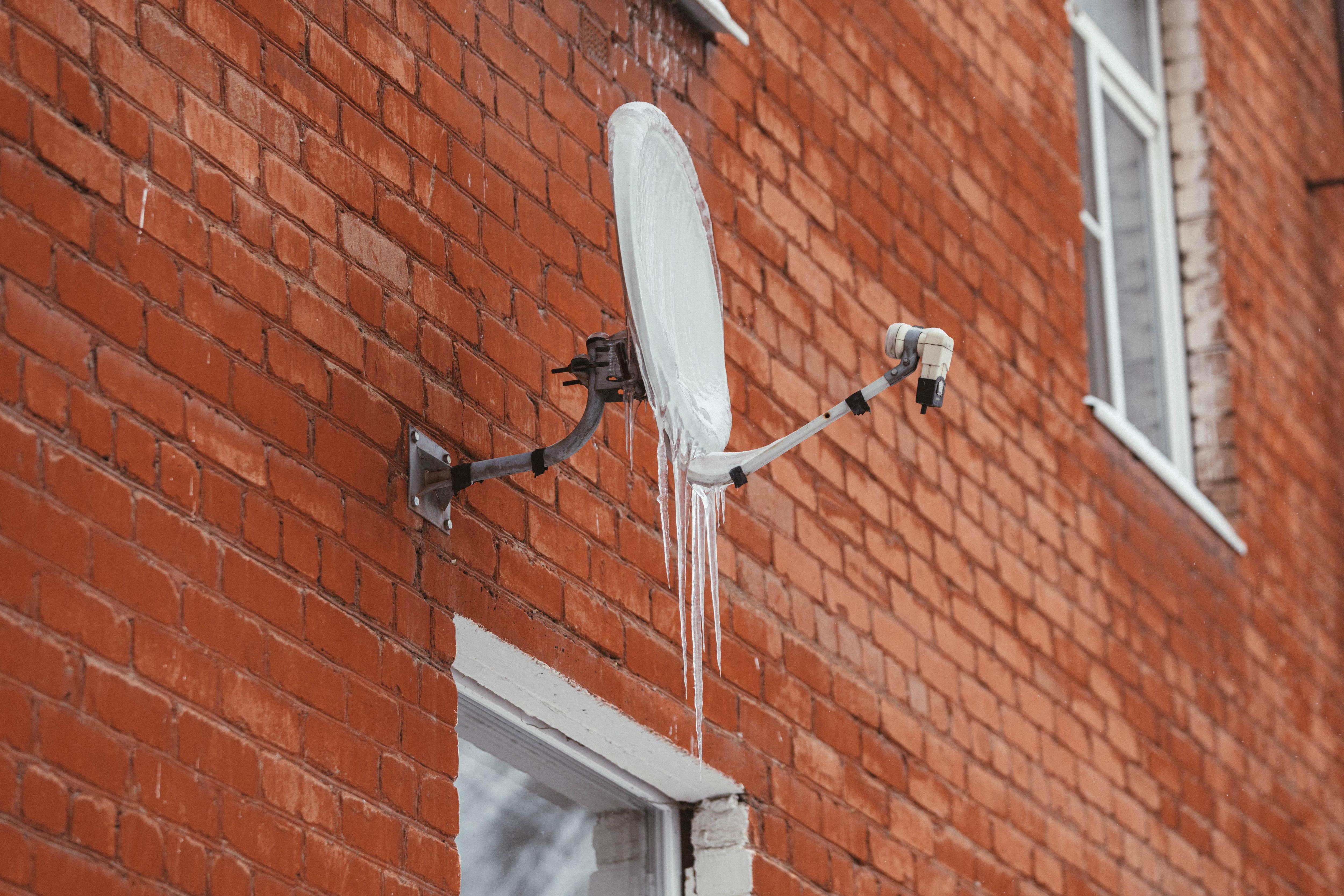 Фасады зданий и спутниковые тарелки покрыты толстой коркой льда.