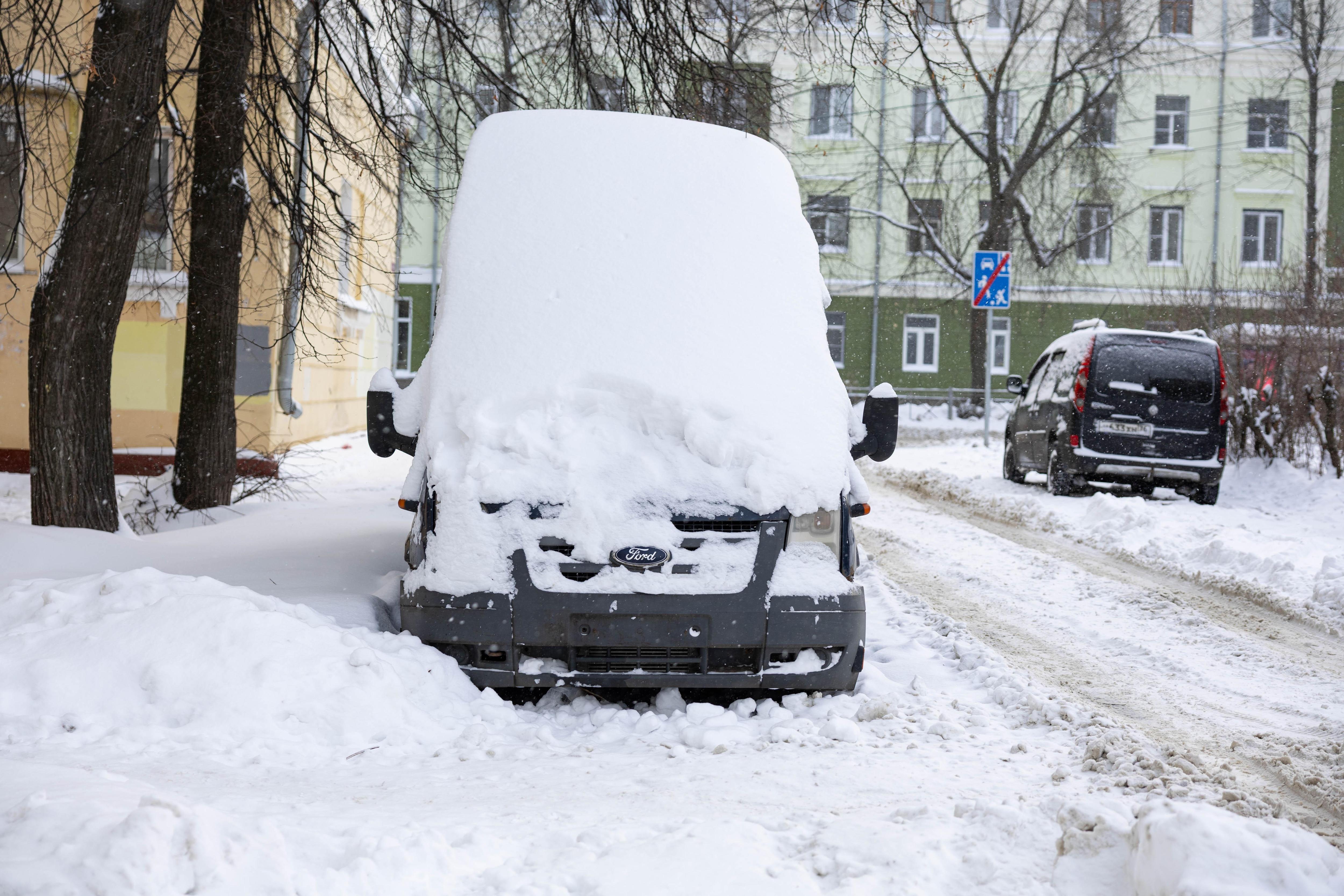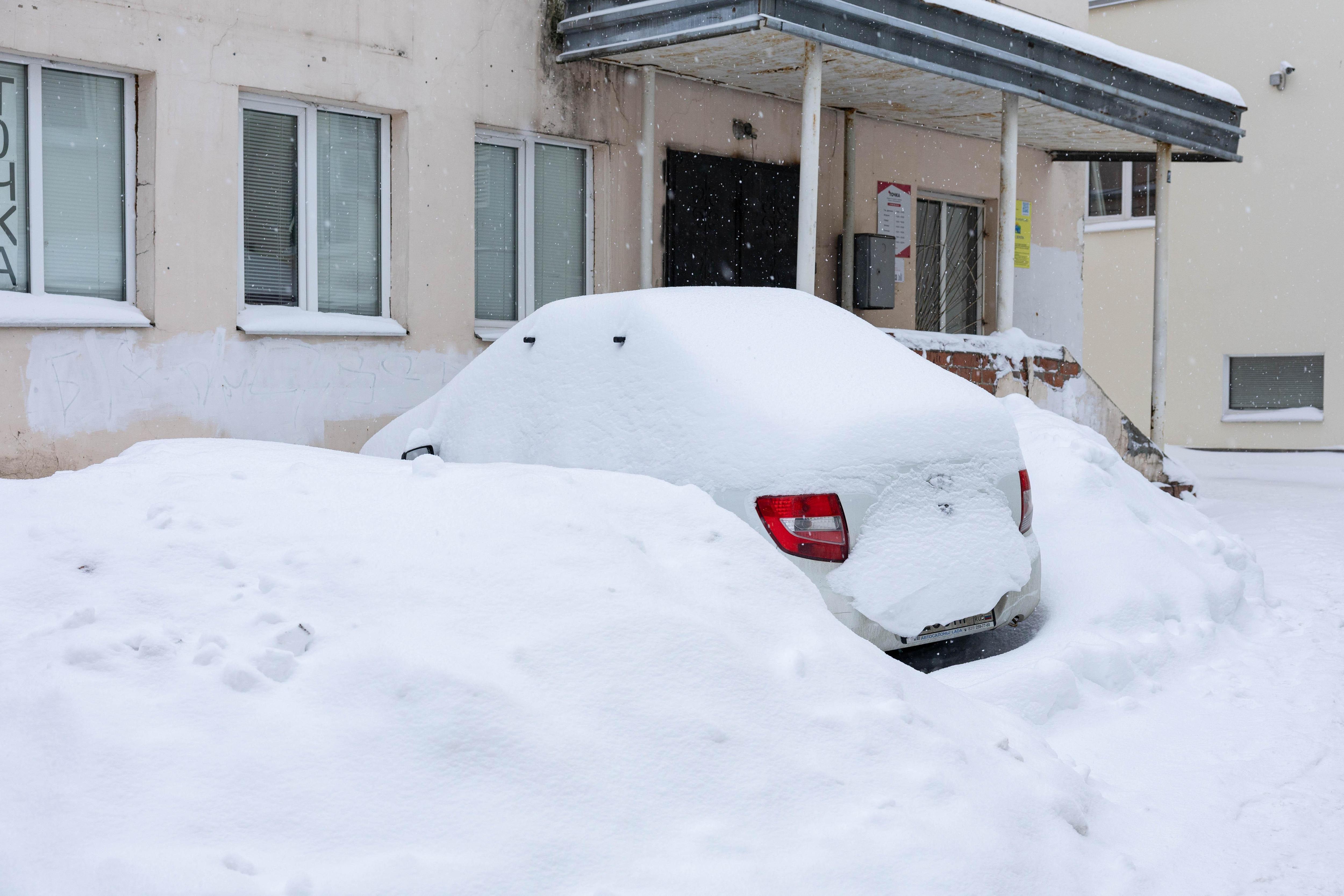 Машину почти не видно под сугробами.
