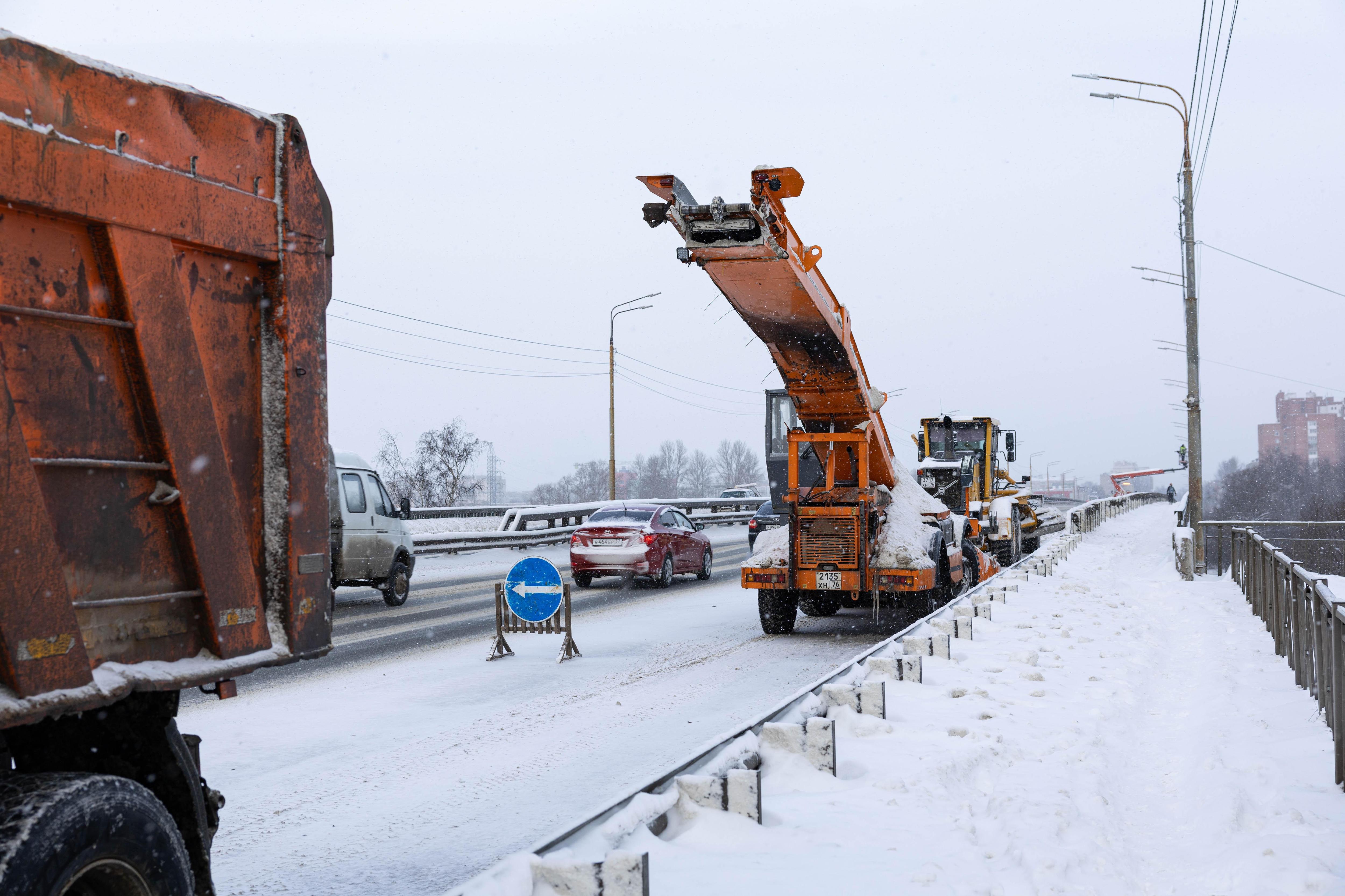Очистку дороги на мосту осуществляли снегоуборочной машиной.