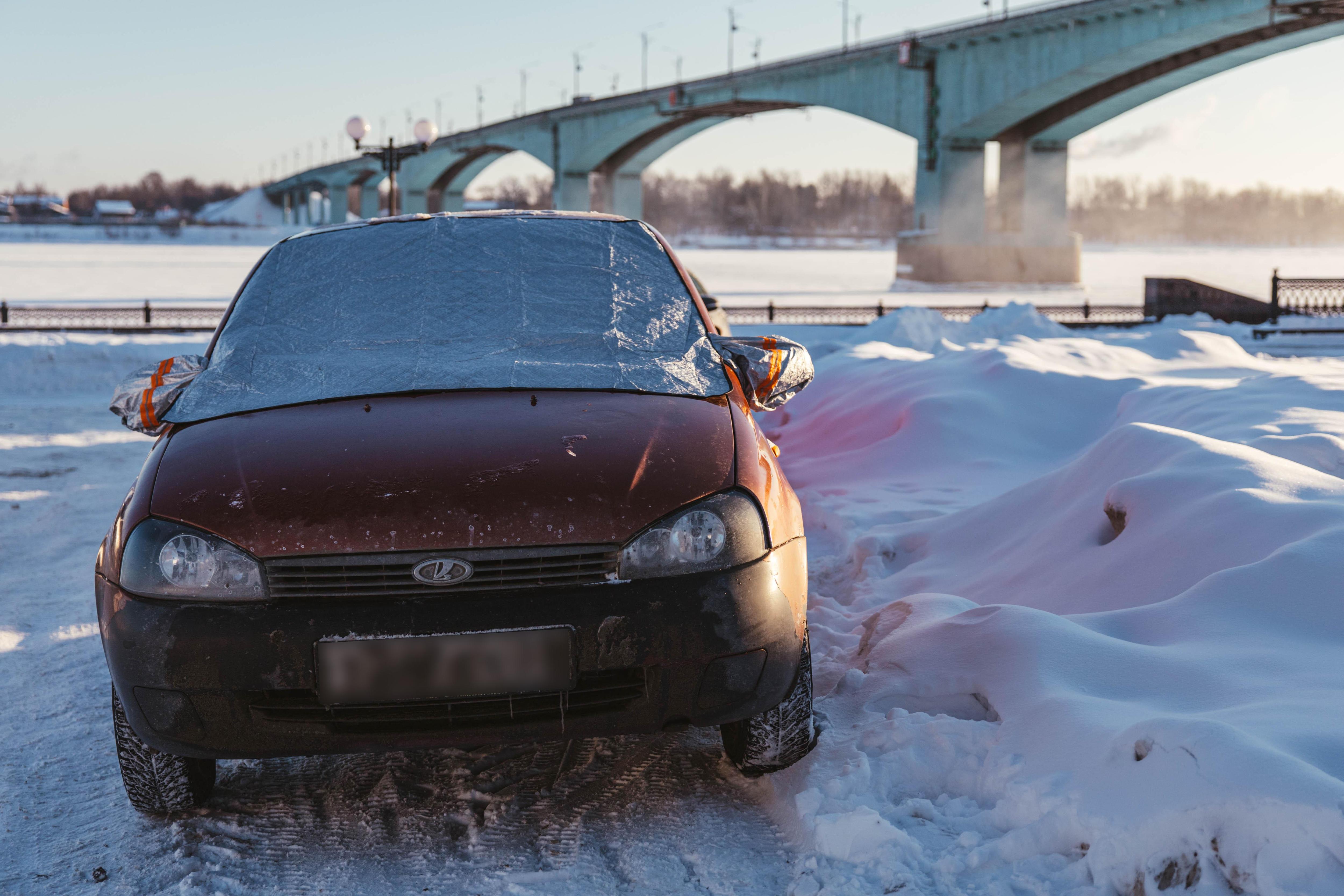 На лобовых стёклах припаркованных автомобилей виднеются защитные зимние чехлы.