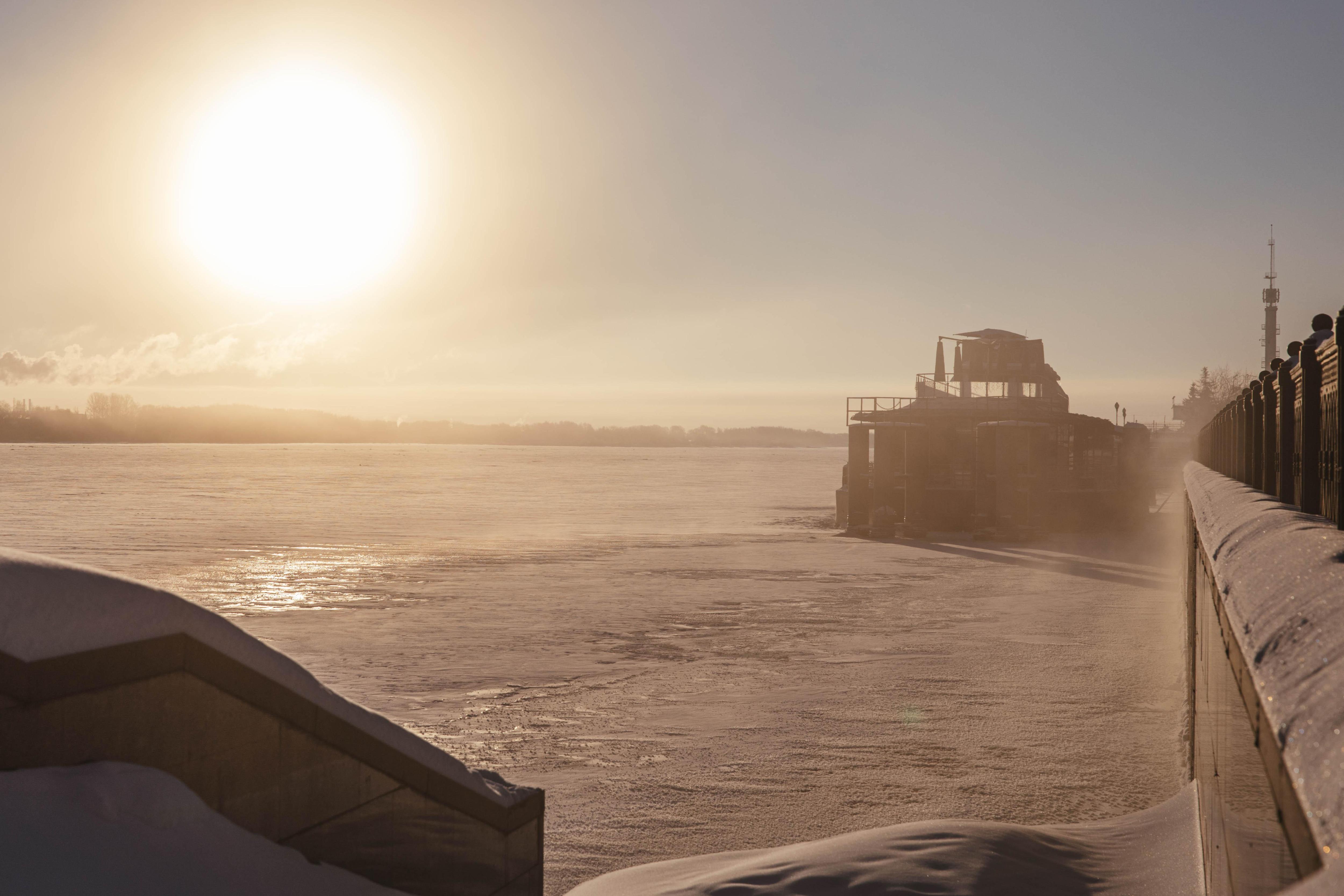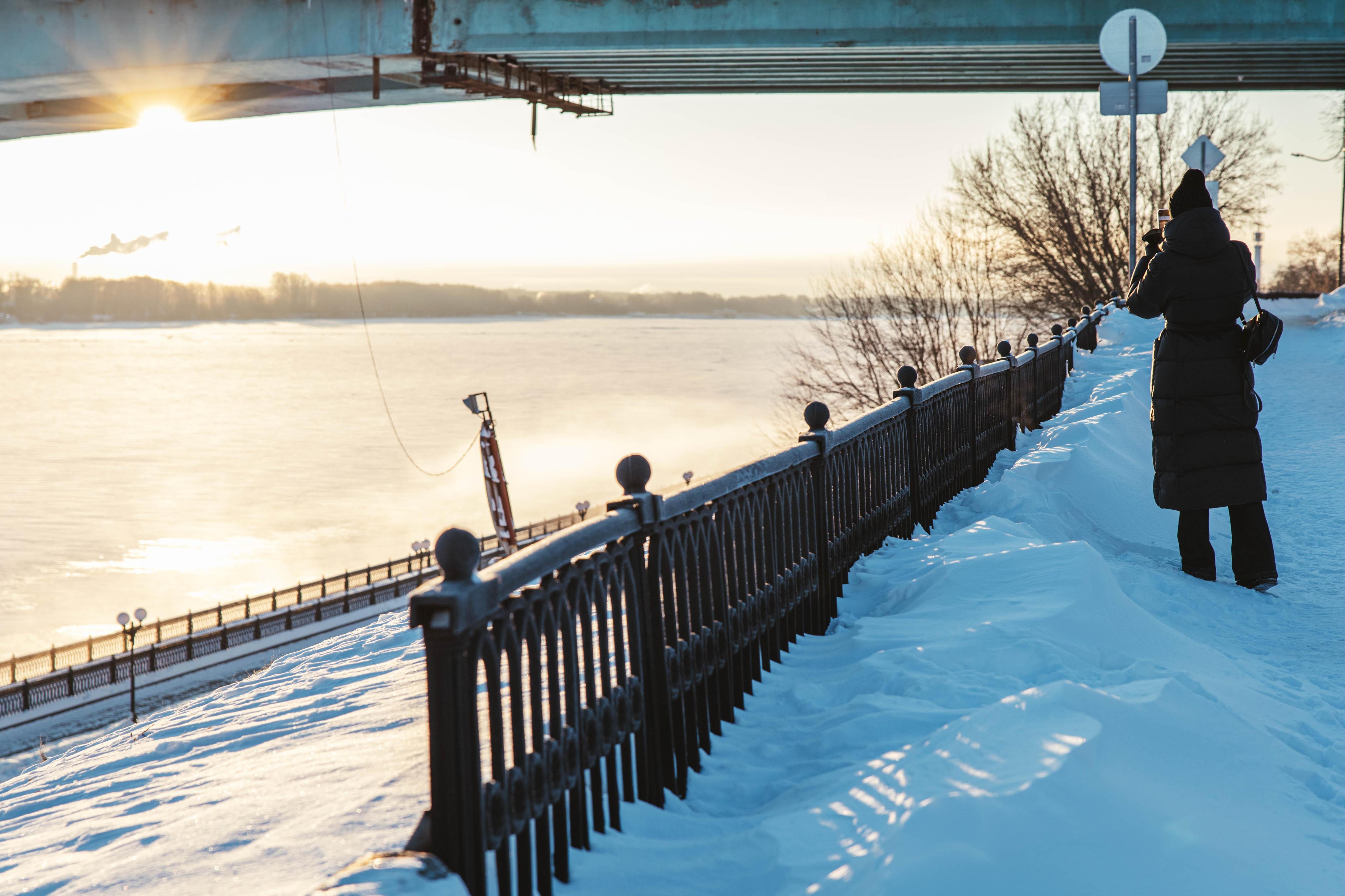 Корреспондент отправился на Волжскую набережную, чтобы зафиксировать это утро, когда солнце окрасило город в тёплые тона, а воздух остыл до -18 градусов.
