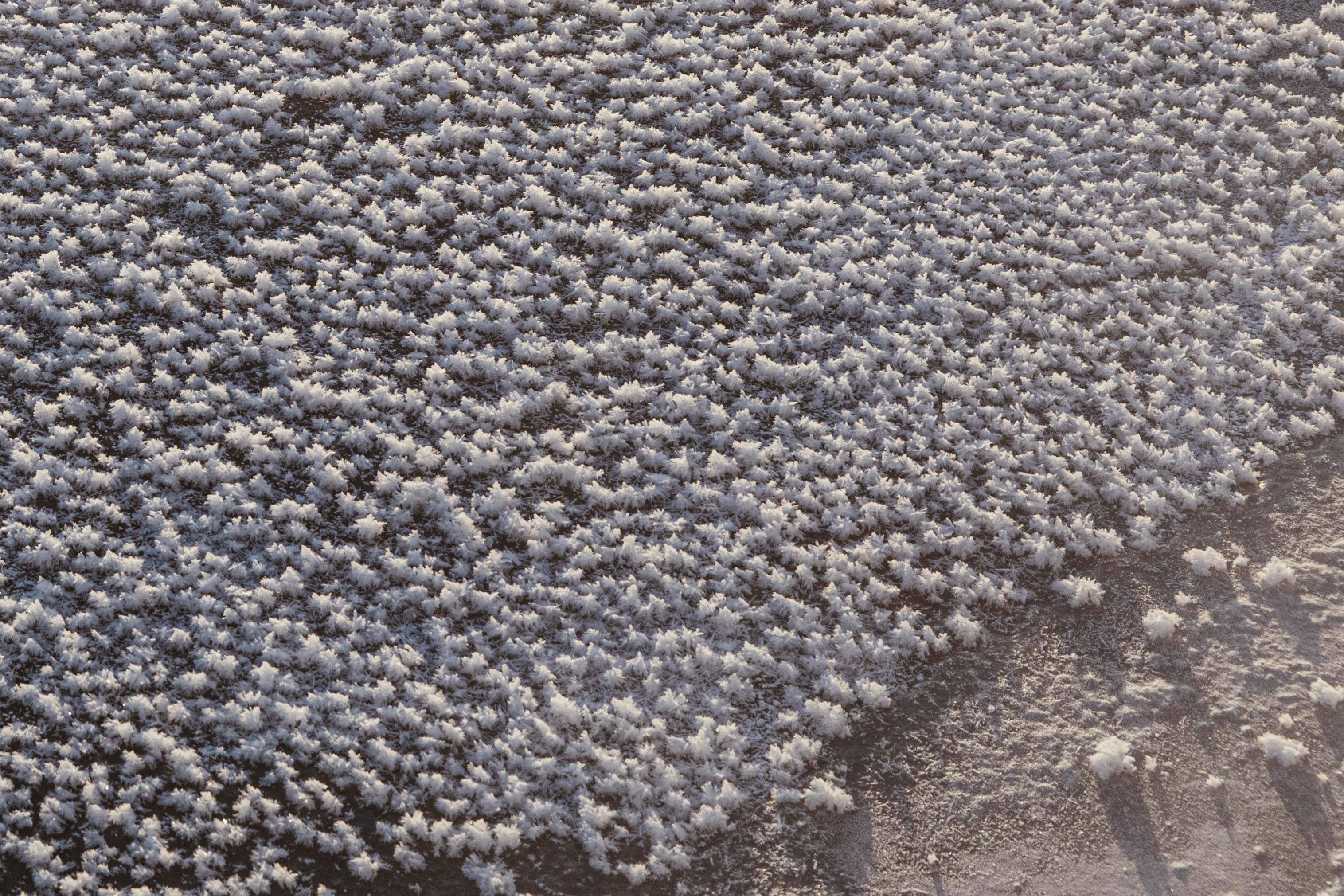 Поверхность льда на реке украшена причудливыми снежными наростами.