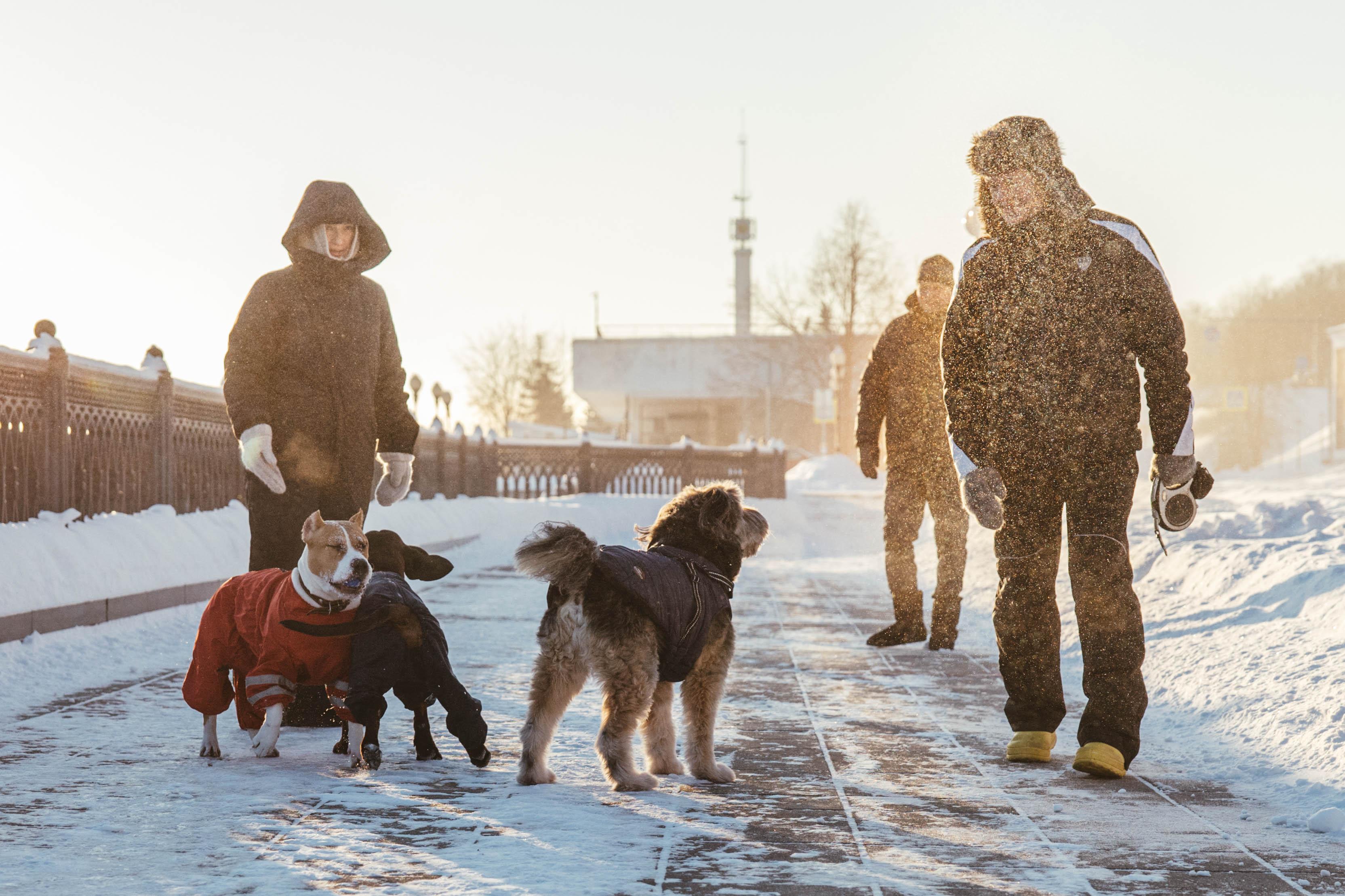 Владельцы собак, несмотря на холод, вывели питомцев на прогулку, укутавшись потеплее.