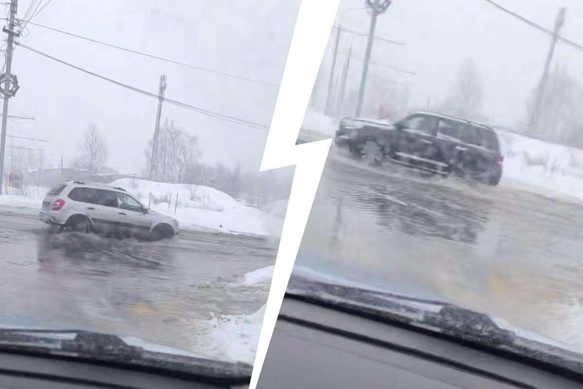 Кадры, снятые очевидцами, показывают, что вода полностью покрыла дорогу, местами достигая середины колес легковых автомобилей. Транспорт медленно продвигается через глубокие лужи, а пешеходный переход оказался под водой.