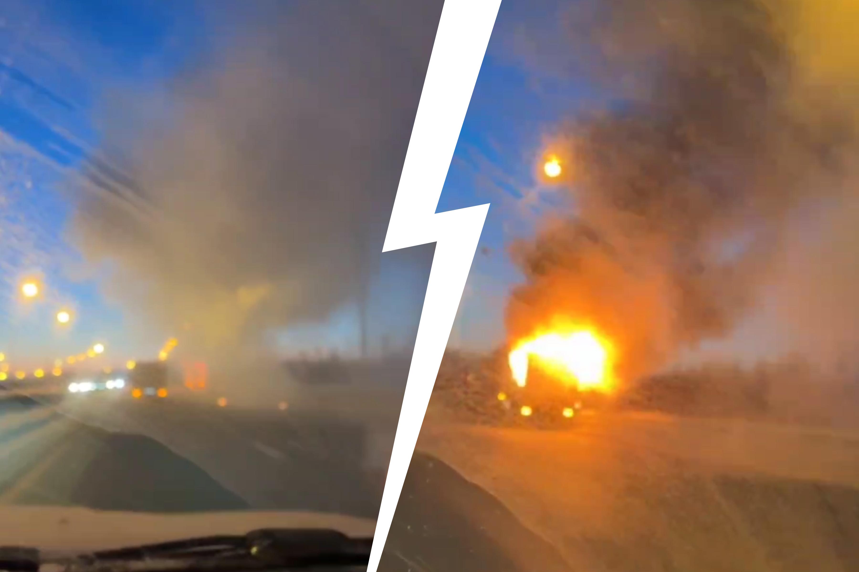 Видеозаписи с места происшествия показали, что автомобиль МАЗ был полностью охвачен огнём, а сильное задымление ограничивало видимость на проезжей части.