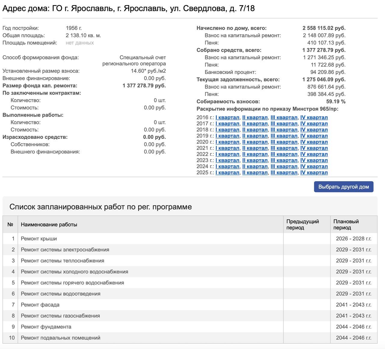 В подтверждение своей позиции управляющая компания предоставила скриншот с сайта Регионального фонда. Согласно размещённым там планам, ремонт крыши дома запланирован на 2026–2028 годы, а ремонт фасада — лишь на 2041–2043 годы.