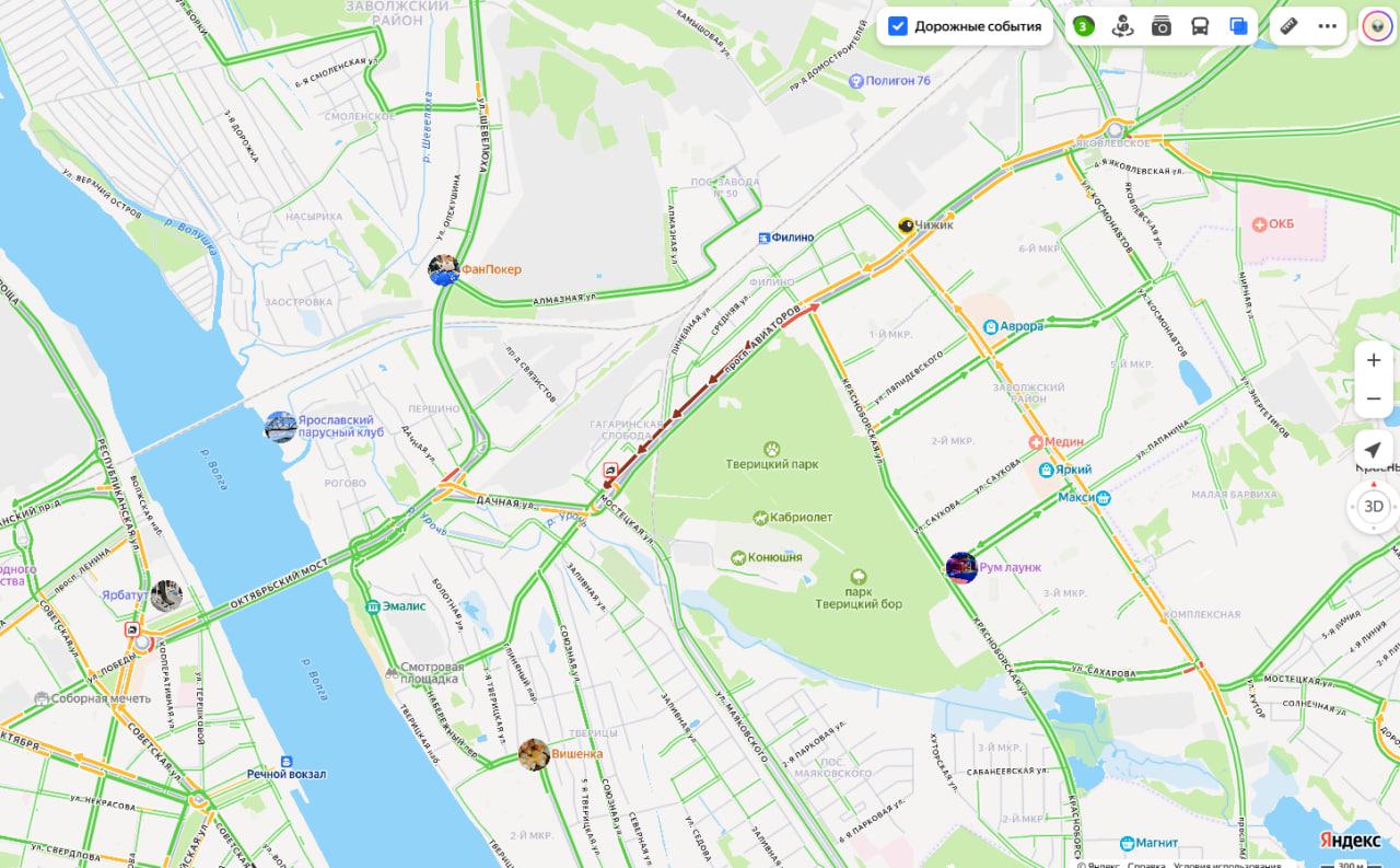 Общий уровень заторов в Ярославле агрегатор пробок оценил в три балла.