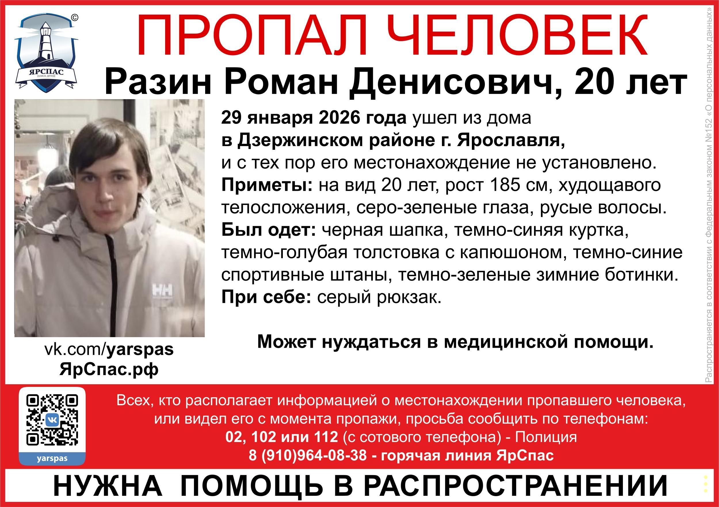 Роман Рамзин ушел из дома в Дзержинском районе Ярославля 29 января и до сих пор не вернулся.