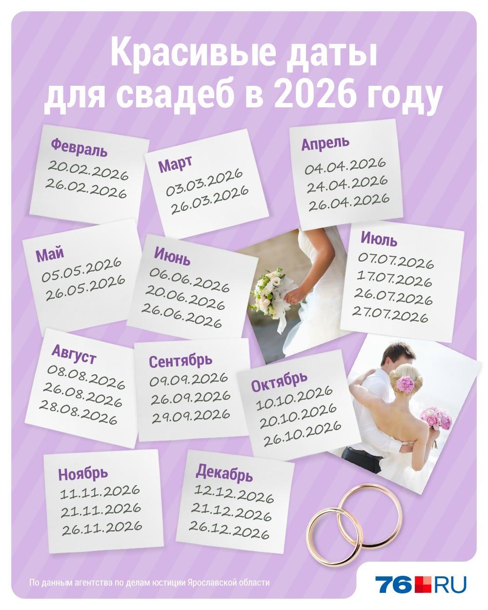 Специалисты ЗАГСа Ярославской области отмечают, что спрос на определённые даты уже формируется. Например, 26 число любого месяца считается популярным вариантом, так как оно гармонично сочетается с цифрами наступающего 2026 года.