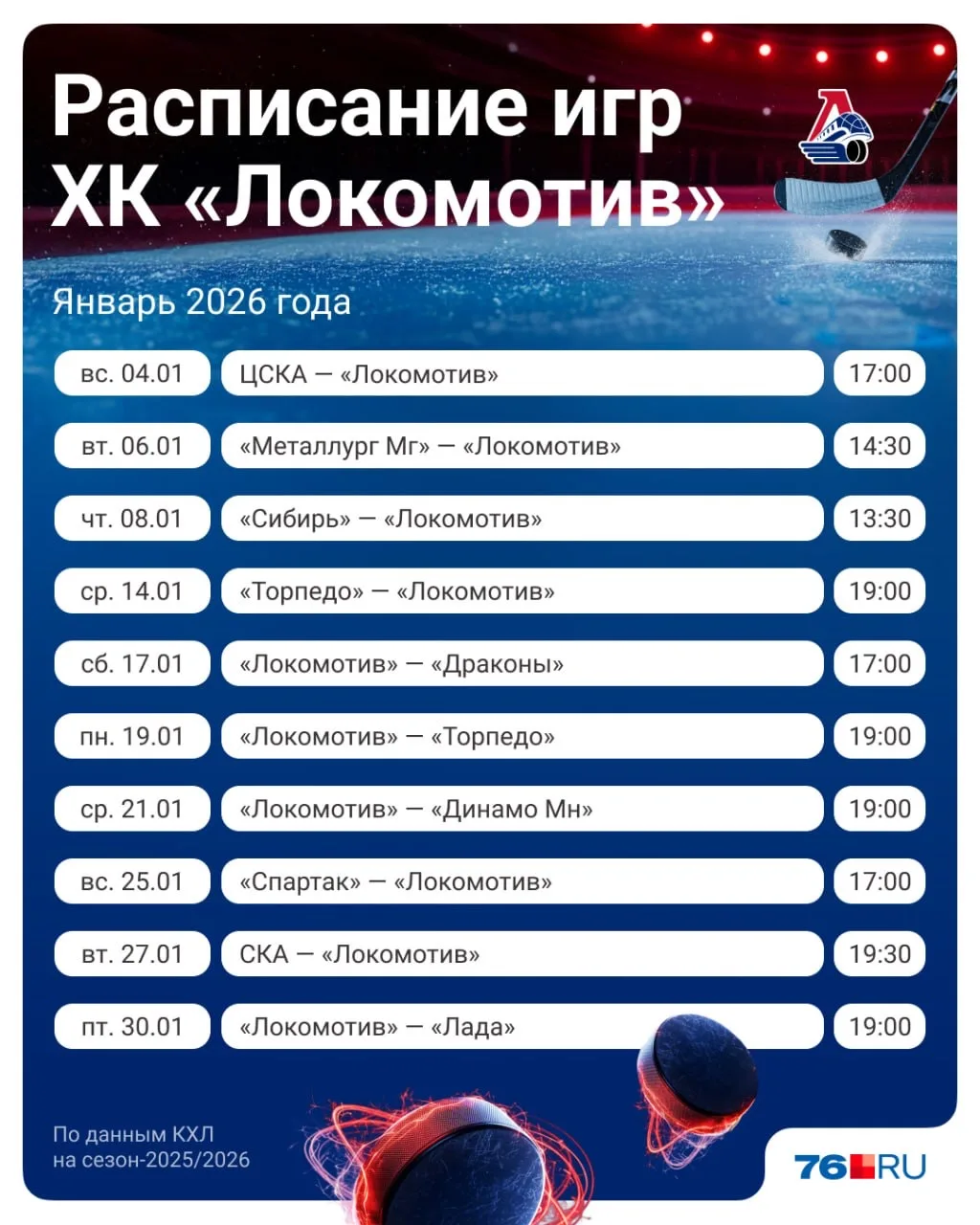 В январе 2026 года ярославский «Локомотив» проведет 10 матчей, из которых четыре состоятся на домашней арене.
