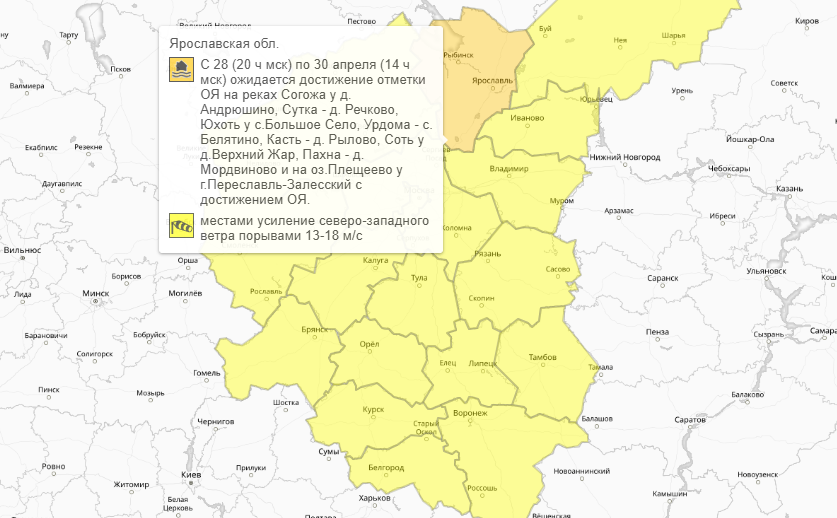 28 апреля спасатели МЧС по Ярославской области выпустили предупреждение о подъеме уровня воды в местных реках. Гидрометцентр России также предупредил о возможном наводнении и присвоил региону оранжевый уровень погодной опасности.