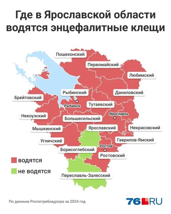 По данным Роспотребнадзора за 2024 год, к наиболее неблагополучным по клещевому энцефалиту территориям Ярославской области относятся: