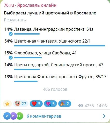 В финальном голосовании приняли участие 406 человек. По его итогам третье место занял магазин «Цветы под аркой» на Ленинградском проспекте, 47. Второе место досталось «Флорбазару» на улице Свободы, 41. А победителем народного рейтинга стала «Цветочная Фантазия» на улице Ушинского, 22/1.