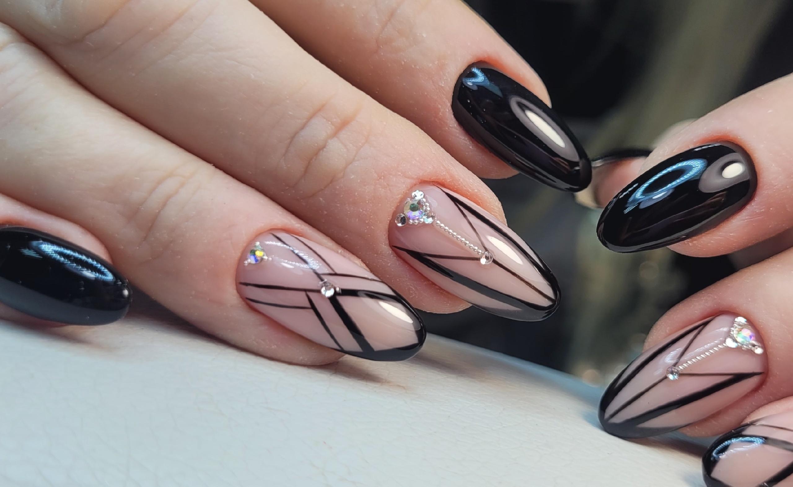 Тёмные оттенки часто используют для универсального праздничного маникюра. Можно нанести однотонное покрытие, а на двух ногтях добавить геометрический узор. Стразы придадут блеск, превращая повседневный вариант в нарядный.