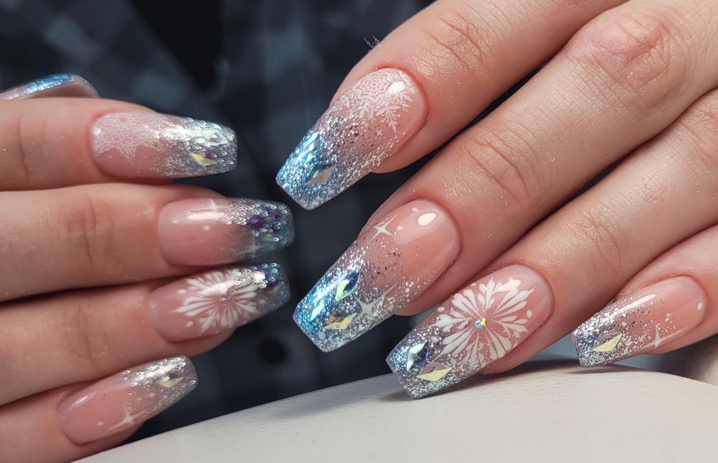 Чтобы передать зимнюю атмосферу, можно выбрать тематическое оформление. Снежинки, блестящие наклейки, стразы и блёстки имитируют снег на ногтях. Такой маникюр идеально подходит для новогодней ночи.