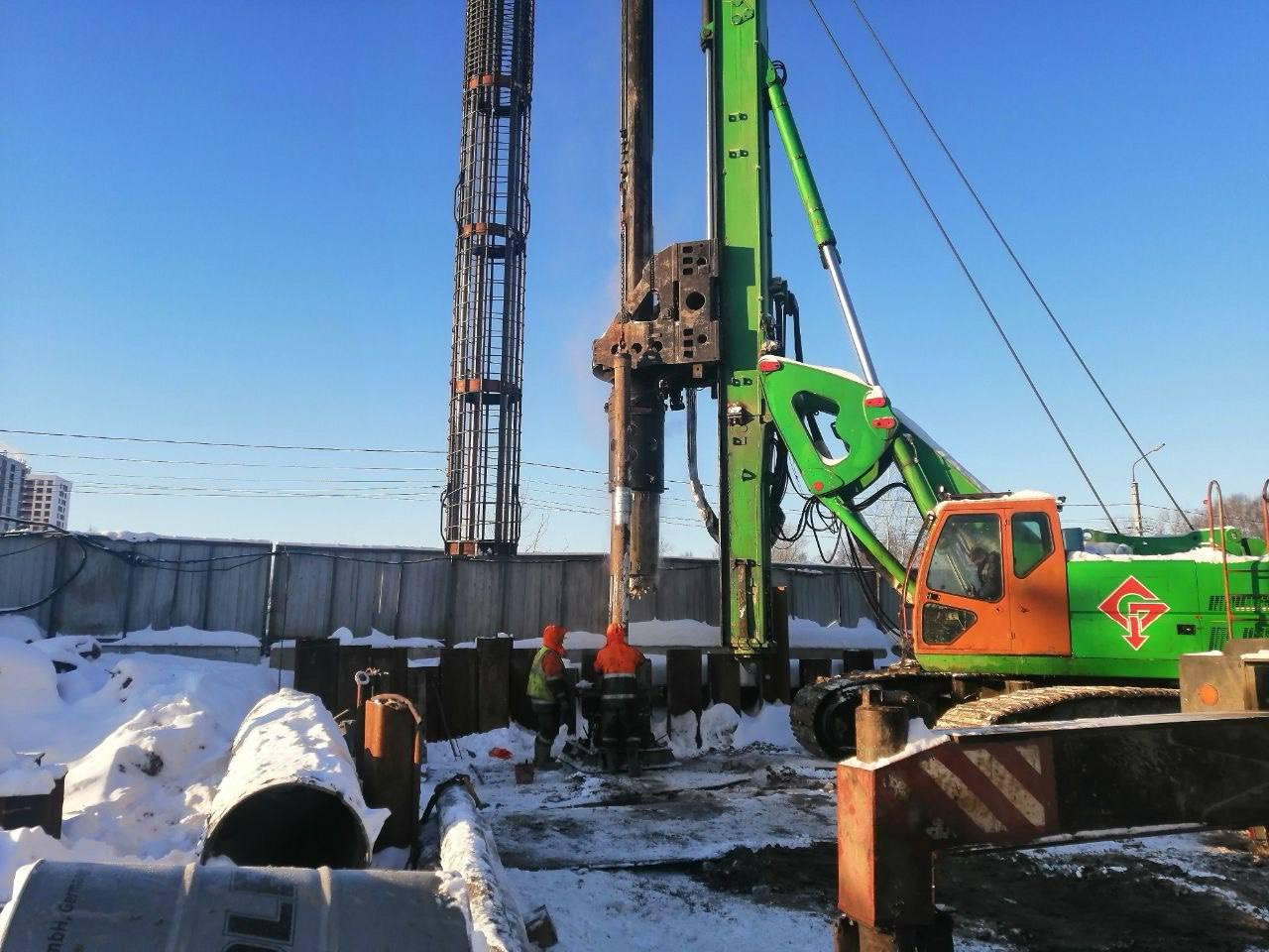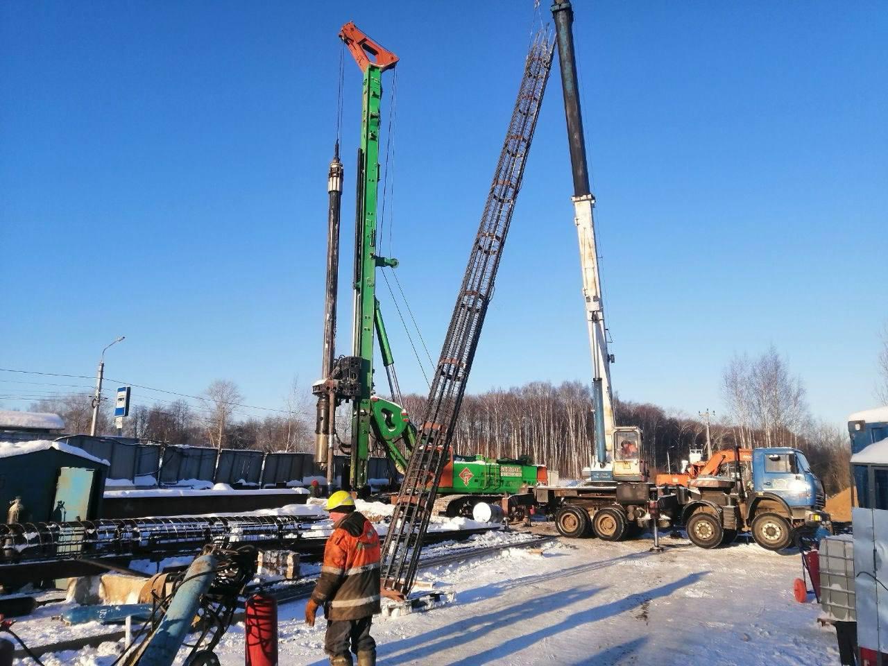 Сотрудники ярославской компании «Мостоотряд-6» забивают сваи для мостовой части сооружения.