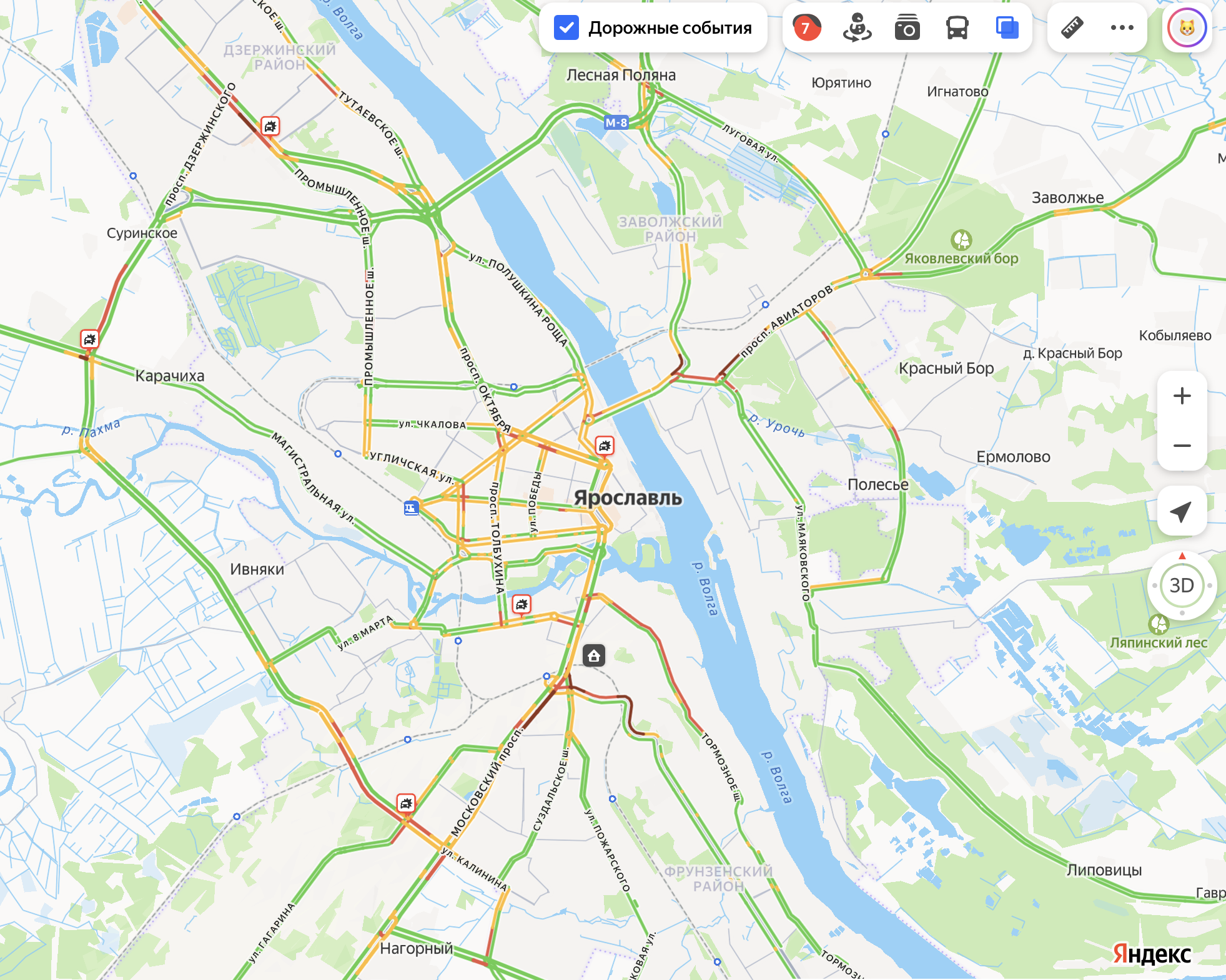 В Заволжском районе движение практически остановилось на проспекте Авиаторов и улице Дачной, которые на картах отмечены бордовым цветом.