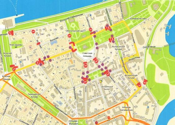 «Временно прекратить движение транспортных средств на участках улиц: Советской, Первомайской, Трефолева, Кирова, Кедрова, Революционной, Нахимсона, Подзеленье, Волжской набережной (верхний ярус), Народного переулка, Советского переулка, площади Челюскинцев», — говорится в документе.
