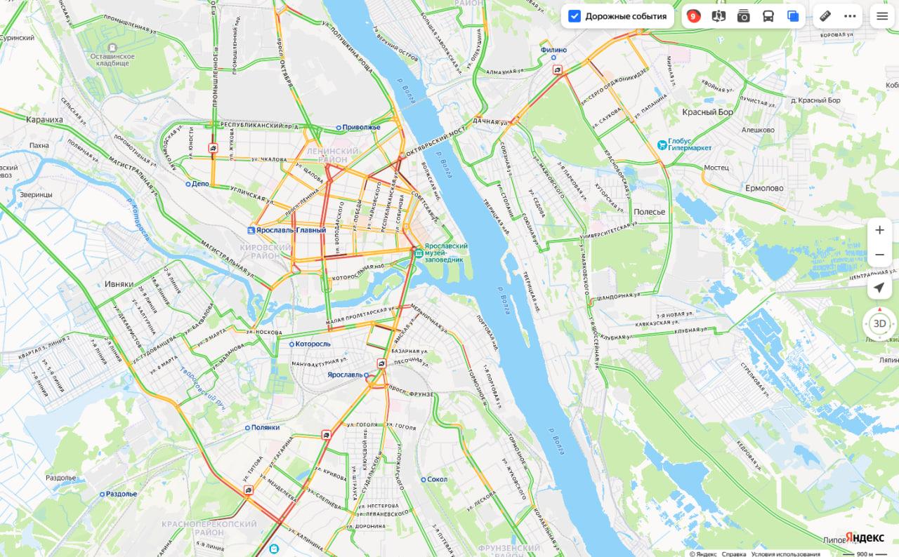 Пик дорожных заторов в Ярославле достиг девяти баллов
